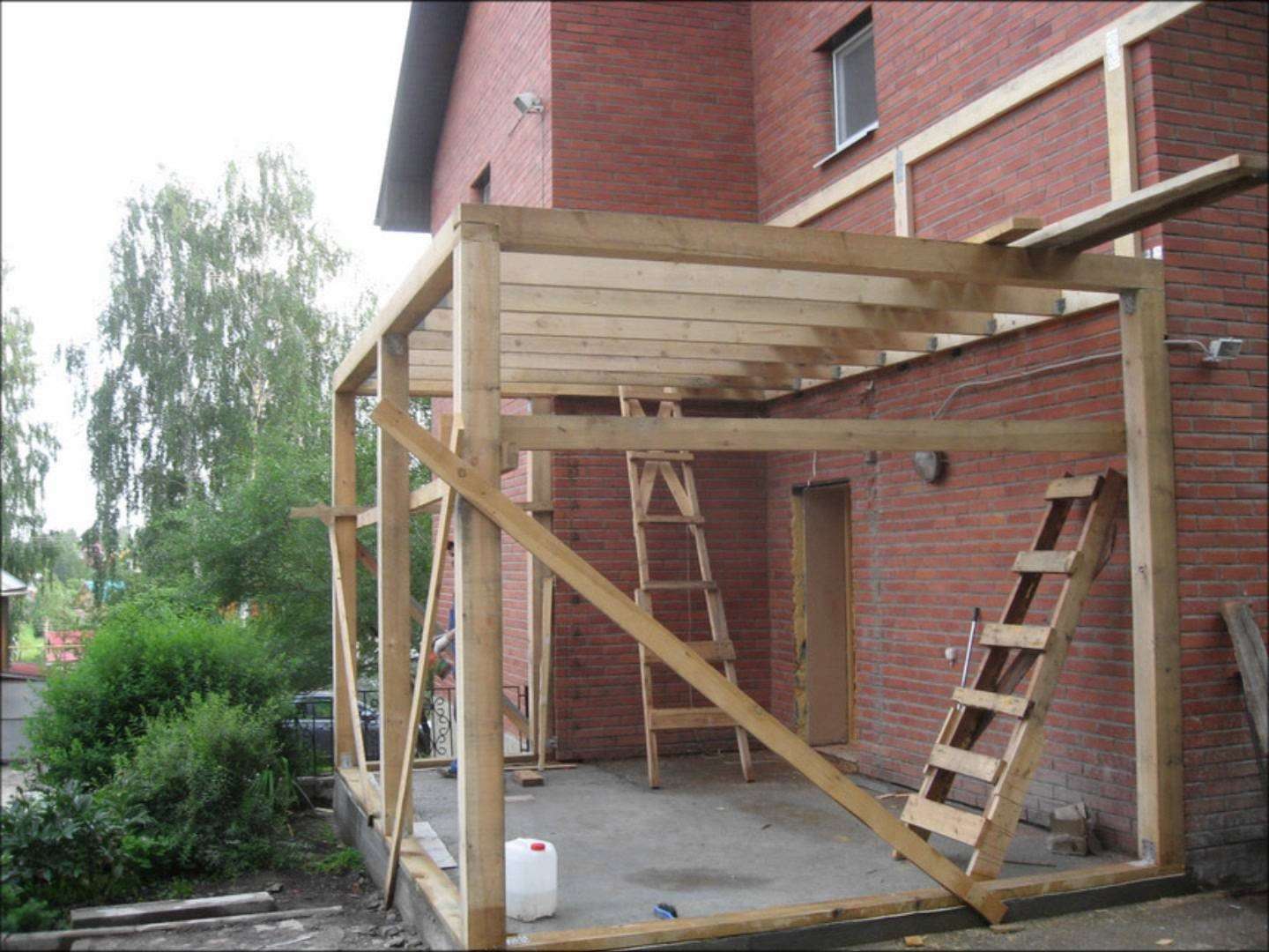 К стене основного здания закрепляется горизонтальная балка. Ее, а также стойки, которые прилегают к стене, укрепляют анкерами.