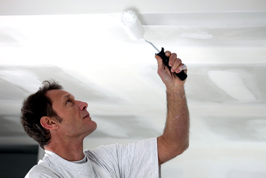 - Старую отделку полностью счищают, убирают пыль и грунтуют перекрытие. Для ГКЛ используют акриловую грунтовку, для железобетонных перекрытий – смесь глубокого проникновения, а при значительных неровностях – бетонконтакт. Для влажного помещения подойдет грунтовка с антисептическими добавками, препятствующими появлению плесени.