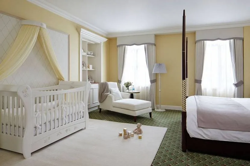 Современная классика останется актуальной ещё не одно десятилетие, поэтому её часто выбирают для спальни молодые родители. Когда в комнате появляется малыш не нужно менять стиль кардинально: подберите для него деревянную кроватку в тон вашей и постарайтесь сохранить симметрию в интерьере. Для поддержания стиля также лучше выбрать не слишком яркое покрывало, а для игрушек предусмотреть удобные для ребёнка места хранения (так на виду не будет много ярких пятен). Чтобы не вносить в комнату диссонанс, откажитесь от традиционно детской мебели из фанеры и ДСП в пользу классической деревянной. Сейчас производители создают детские коллекции и всегда есть возможность заказать столик или стульчик индивидуально.