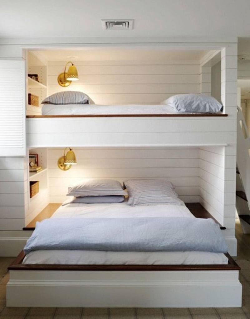 Ранее подобные варианты изготавливались только для детских, но теперь, когда квартиры-студии стали нередким явлением и в России, в продажу вышли многоуровневые сложные конструкции с тремя спальными местами. На нижнем ярусе располагается кровать родителей, а на верхнем — спальное место ребенка. Это решение прекрасно подойдет даже для очень узкой комнаты.