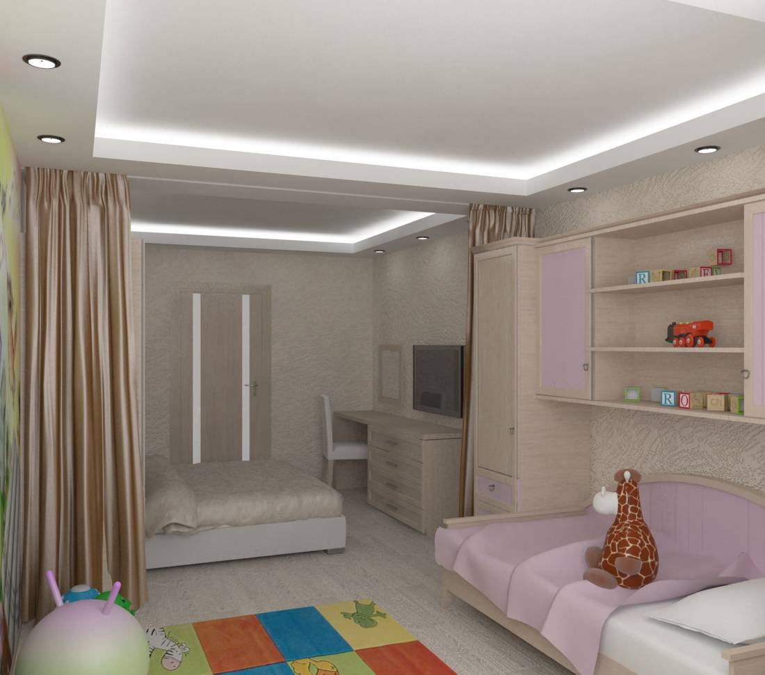 Если позволяет материальное положение, зрительно поделите пространство на две части, используя подвесные потолки, расположенные на разных уровнях. Для задачи разделения подойдет и подиум. На подиум устанавливают детскую кровать, стол и шкаф.