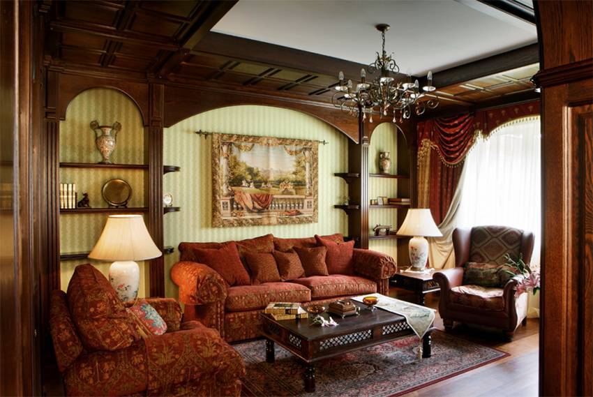 Для отделки помещения в английском стиле используется дерево и текстиль