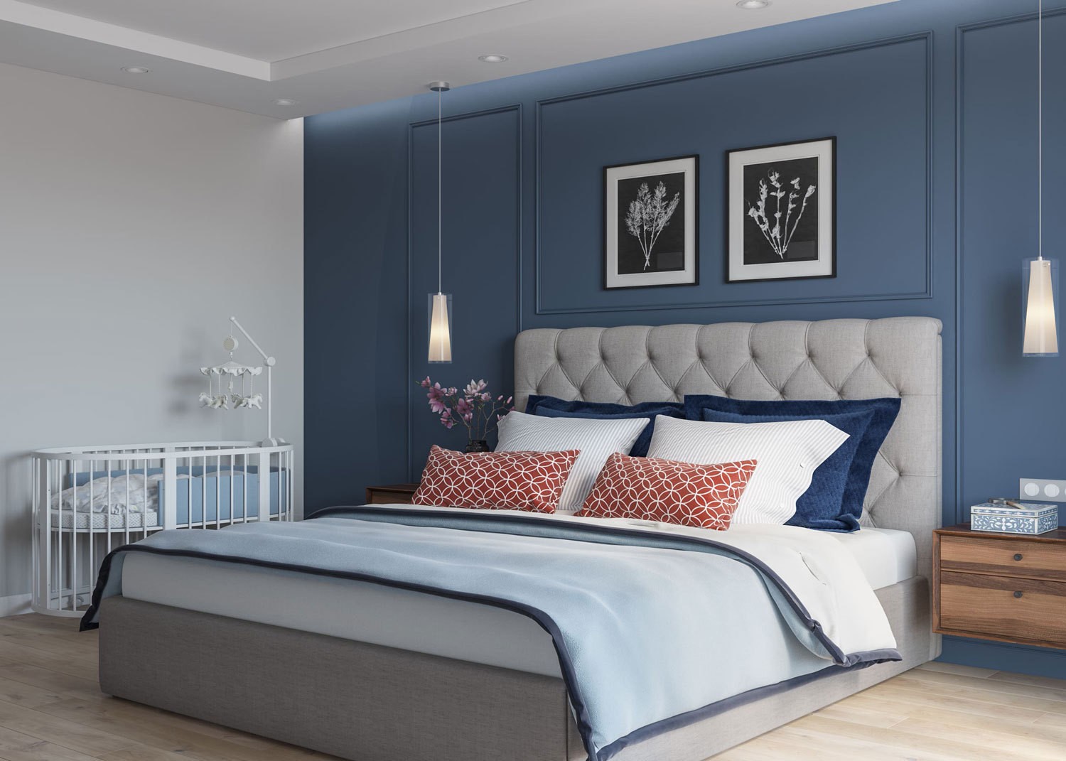 Сине-голубые тона относятся к холодному спектру, пространство в таком оформлении кажется прохладным. Голубая или синяя спальня — хороший вариант для комнат, выходящих на солнечную сторону, в затененных помещениях синий и голубой рекомендуется разбавлять теплыми красками: песочным, сливочным, бежевым, коралловым, приглушенным желтым.