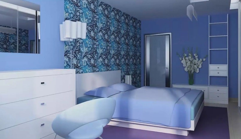 Голубой спектр подойдет для маленькой комнаты. Он визуально расширяет пространство, делает помещение светлым. Дизайн в голубых тонах нельзя перегружать массивной мебелью и тяжелым декором. Гармонию и легкость подчеркнут изящные линии в оформлении. Яркий голубой оттенок сочетают с нейтральными цветами. К небесно-голубому добавляют интенсивные тона. Он сочетается с желтым, серым, фиолетовым, зеленым, белым. Часто голубой выбирают для детской спальни, особенно – для мальчика.