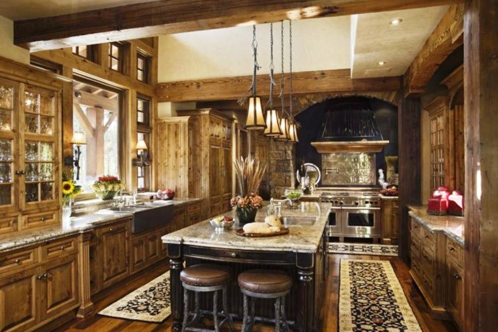 Кухня в итальянском стиле в квартире или доме не обойдется без деревянных балок на потолке. Они могут выполнять лишь декоративную роль, но массив стоит непременно покрасить в темный цвет. Кроме того, балки можно стильно декорировать связками искусственных овощей и фруктов.
