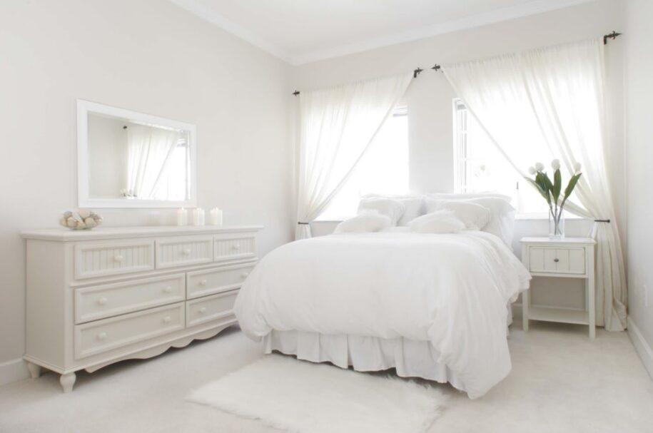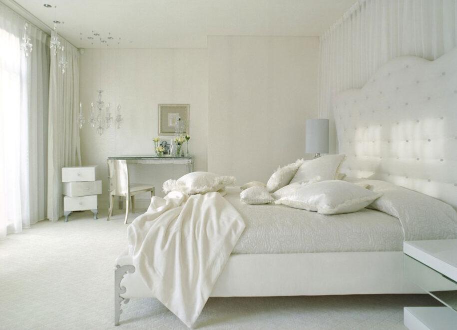 Холодный белый интерьер можно «согреть» теплыми цветовыми акцентами в виде аксессуаров, текстиля и ковриков из натурального меха. Имея хороший вкус и фантазию, можно почти «безоттеночный» цвет обыграть так, что привычная спальня заиграет новыми красками. Хорошие примеры – фото белой спальни в разной стилистике.