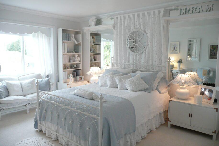 Пастельная спальня в стиле кантри — очень популярный вариант оформления. Наиболее подходящие цвета для данного решения: светло-голубой, нежно-розовый, светло-желтый и лавандовый тон.
