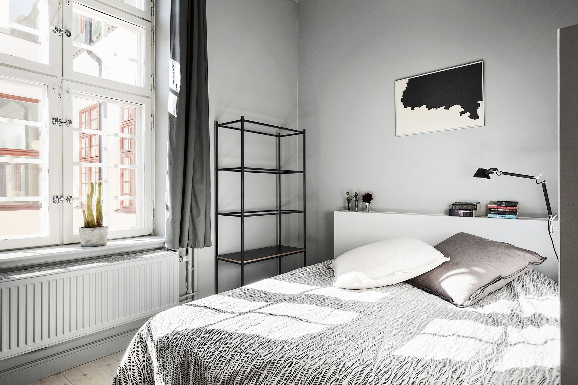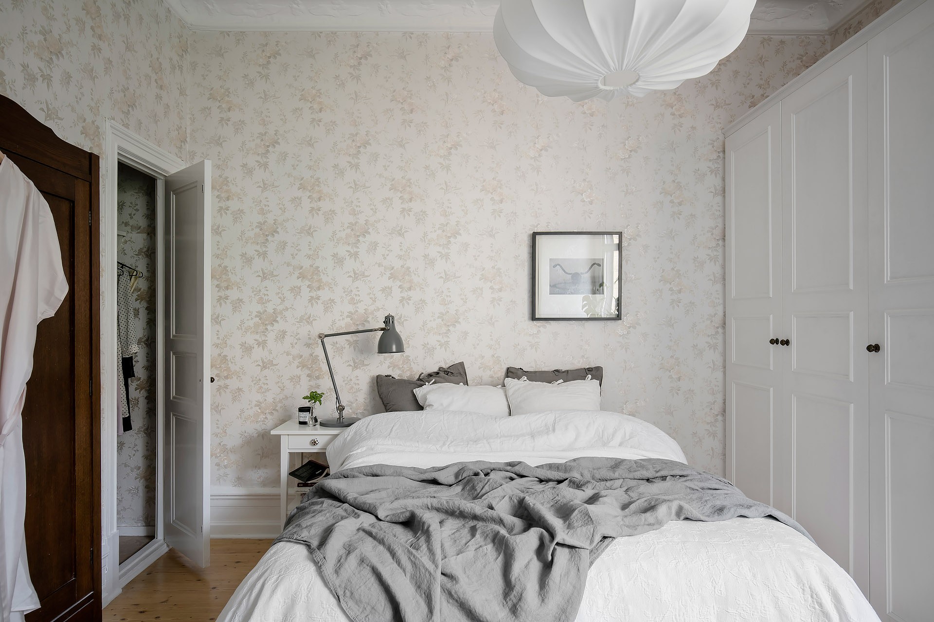 Если белые стены для вас слишком радикальный вариант, то обратите внимание на светло-серый: он тоже любим шведскими дизайнерами. Также в скандинавской спальне вполне может быть одна акцентная стена, правда, лучше выдержать стилистику и отдать предпочтение деревянной отделке или графичным обоям (никаких цветов, розочек и так любимых россиянами дамасских узоров)