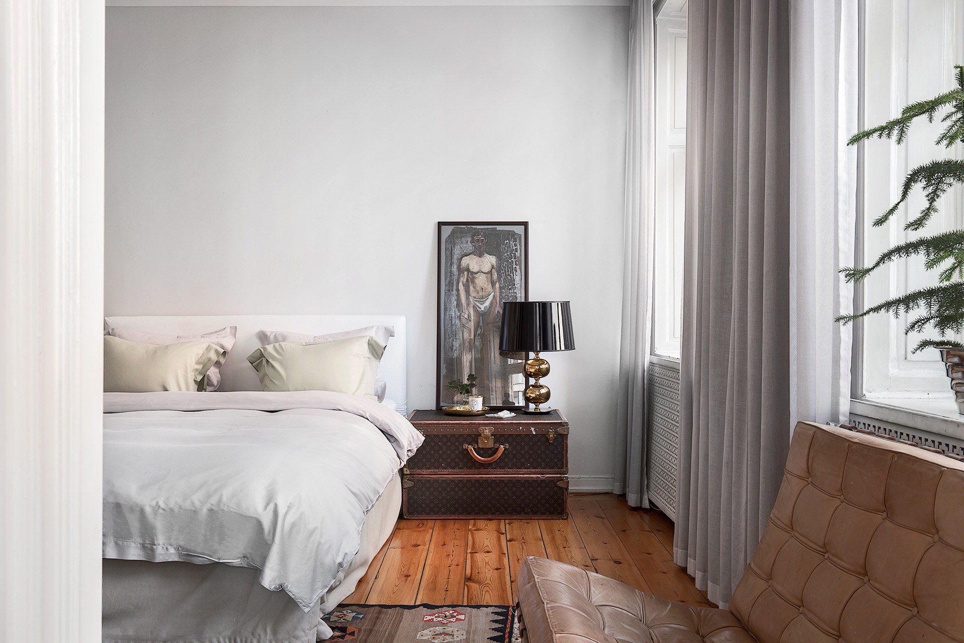 В заключение рассмотрим пример того, как можно придать сдержанному скандинавскому дизайну романтичность и элегантность. Цвет кофе с молоком, утончённые торшеры, подвязанные шторы, окантовка на покрывале, немного лепнины под потолком и рельефные подушки на скамье украшают интерьер, сохраняя общую концепцию.