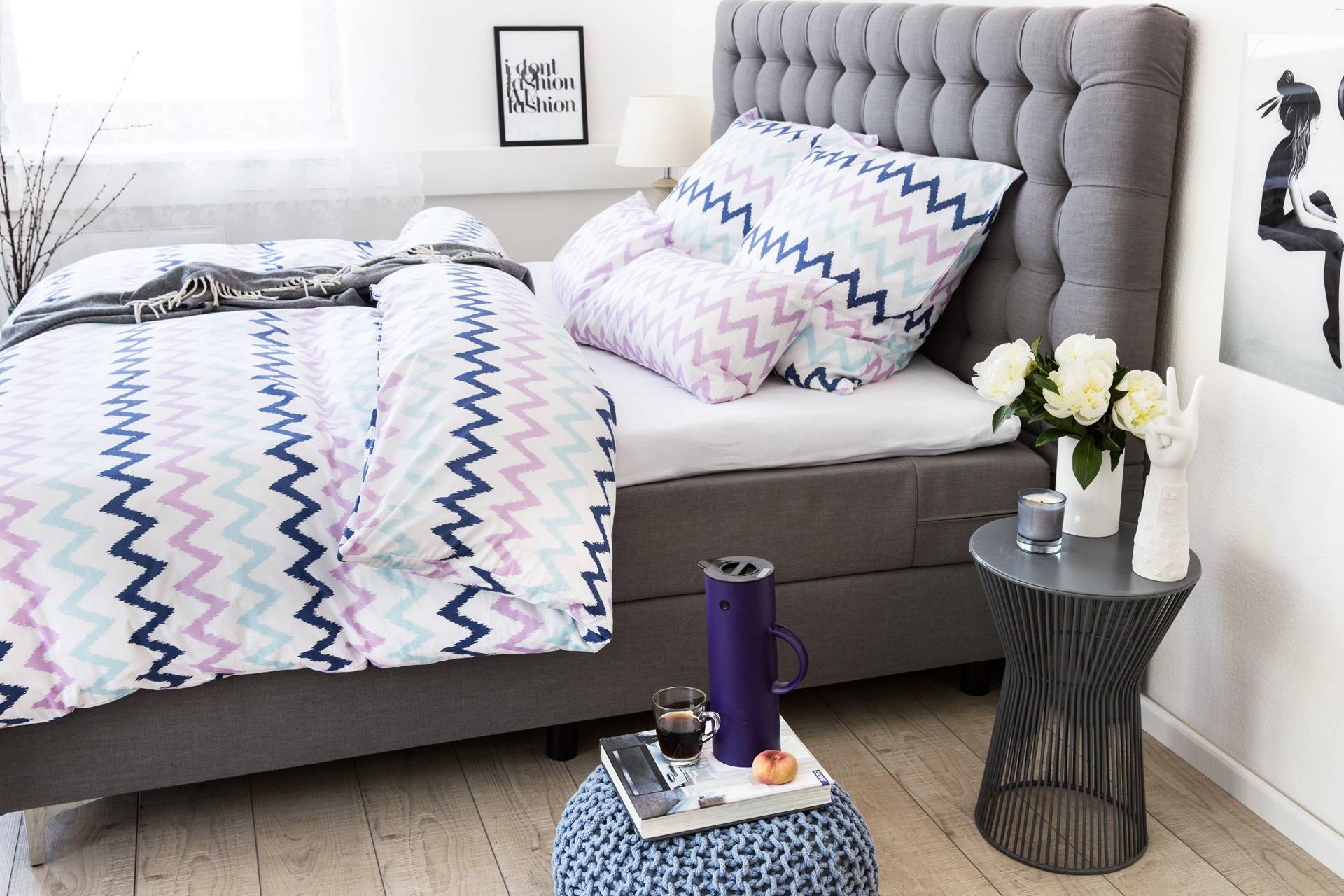 Теперь рассмотрим пример стандартной спальни в скандинавском стиле: белый потолок и стены, однотонное серое постельное белье, постер над кроватью, деревянные балки в качестве декора и минимум других предметов.