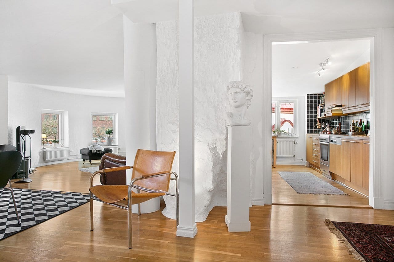 Потолки обязательно должны быть светлыми. Никакую лепнину, роспись или иные яркие элементы на них не размещают. Скандинавы испокон веков потолки просто штукатурили и красили или белили. Эта практика сохранилась и до наших дней.