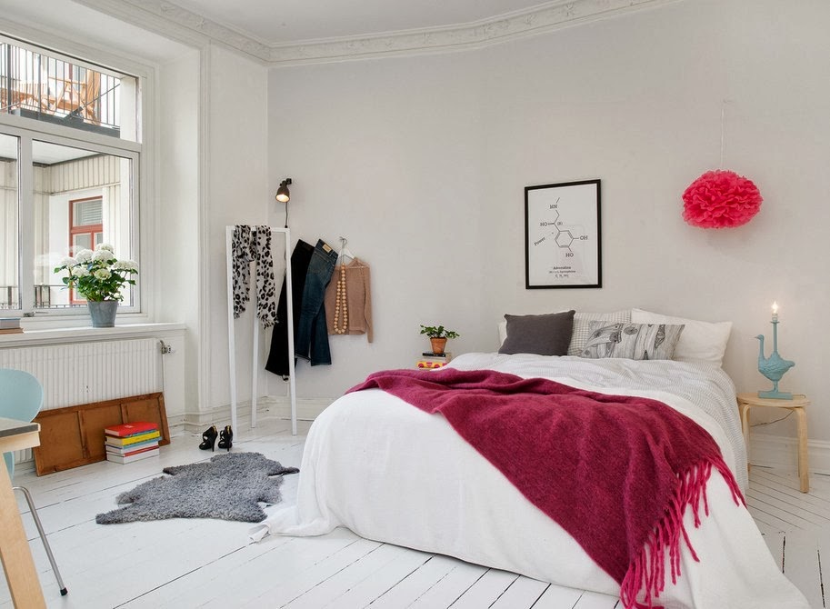 Контрастное сочетание дерева с белыми стенами и яркие акценты на кровати привлекают всё внимание. Таким образом, нет необходимости использовать какие-либо дополнительные предметы мебели или декора