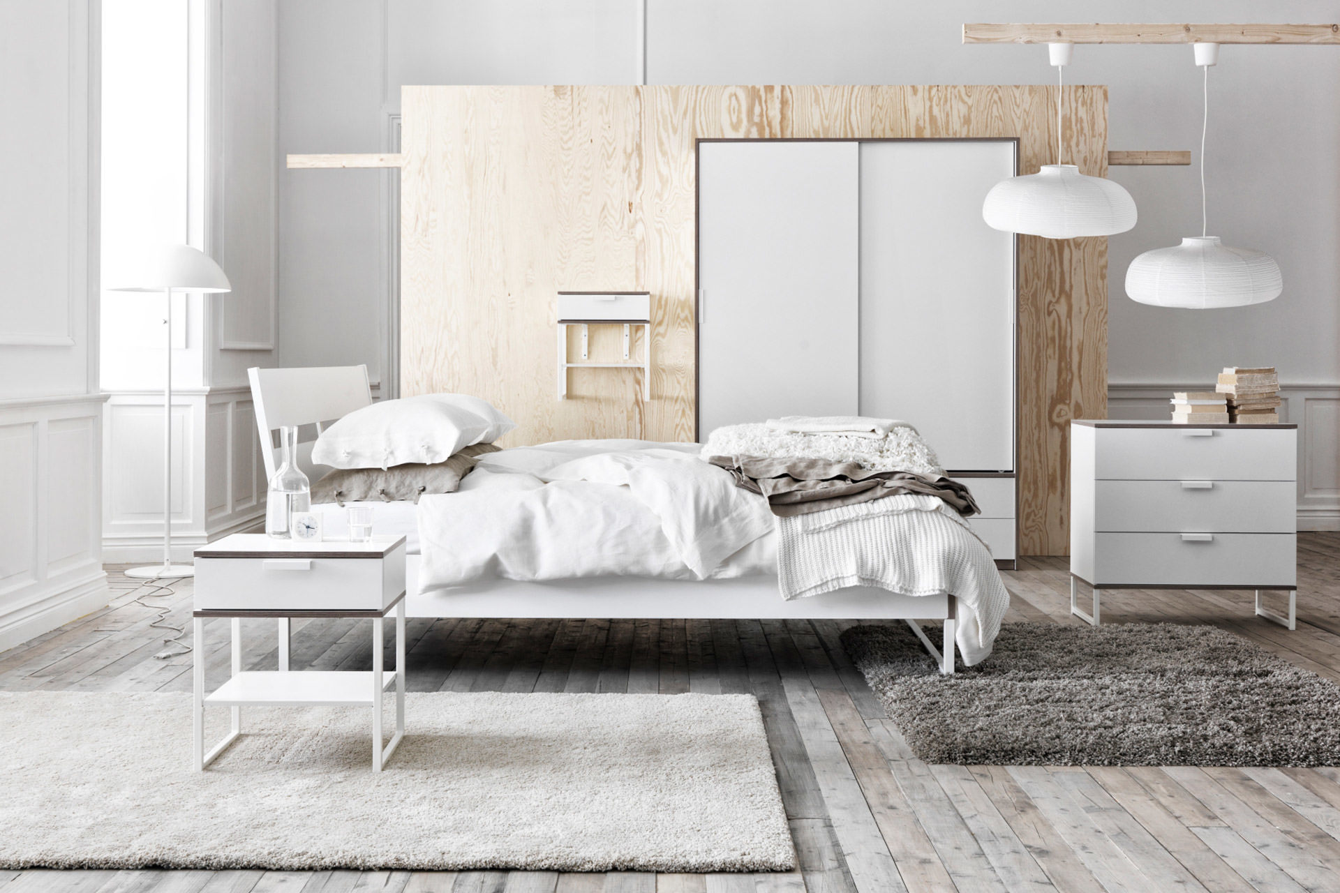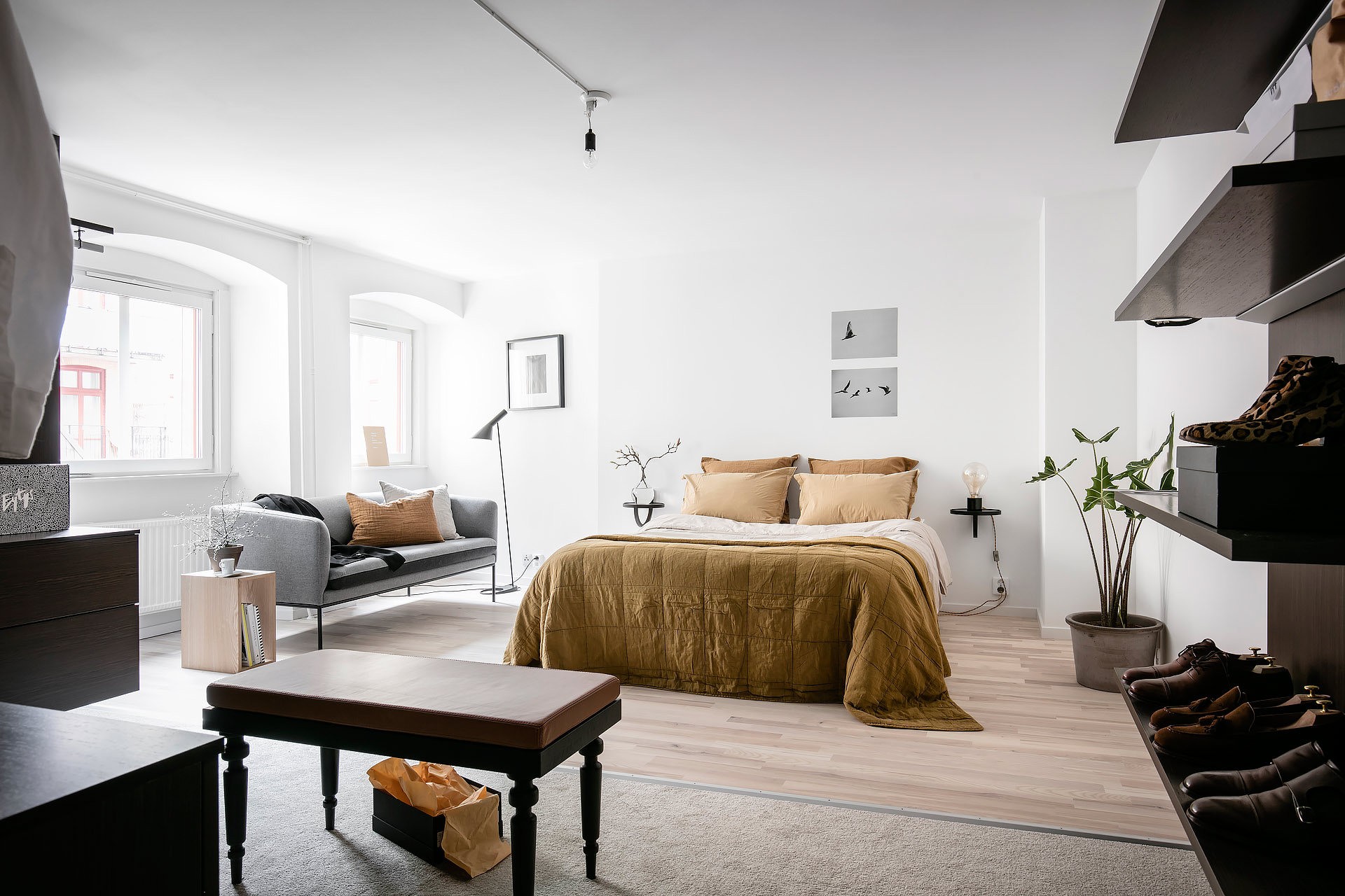 Определенно, функциональная и по-минимуму. Скандинавы не заставляют каждый свободный сантиметр мебелью. В некоторых дизайнерских проектах в спальне можно увидеть одну лишь кровать и тумбочку сбоку. Если площадь позволяет, то помимо кровати в спальне могут быть прикроватные тумбочки (желательно деревянные) , кресло с накинутым на него пледом или меховой шкурой, а также комод (реже — белый, сливающийся со стеной шкаф). Системы хранения в спальне, как правило, все спрятаны