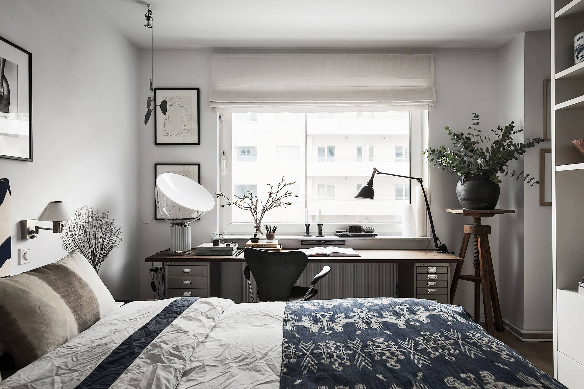 Следующий интерьер — это пример оригинального дизайнерского решения, грамотного сочетания цветов и расстановки акцентов. Скандинавский характер сохранён за счёт светлых стен, акцента на деревянную мебель естественного цвета и декоративной ветки. А её чёрный цвет, чёрно-белые фотографии и тёмно-серое постельное белье вносят оригинальность и придают особый запоминающийся вид помещению.