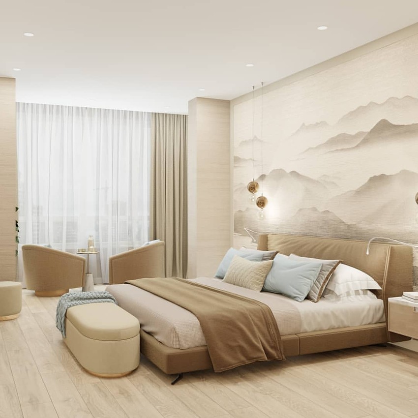 Бежевый — замена серого для северных комнат. Он сделает интерьер спальни уютным.