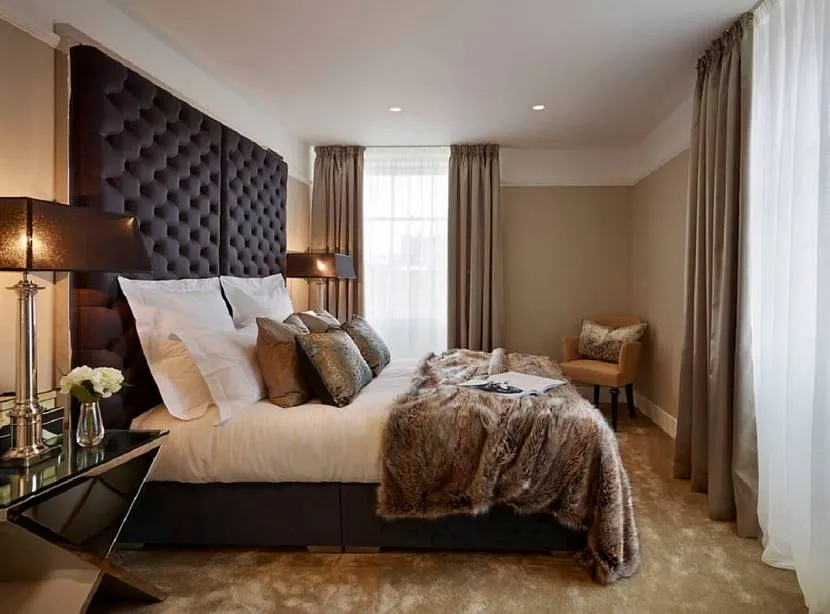 Классика – в спальной в стиле модерн принято использовать бежевые тона, потому как цвет вызывает особое умиротворение и чувство спокойствия.
