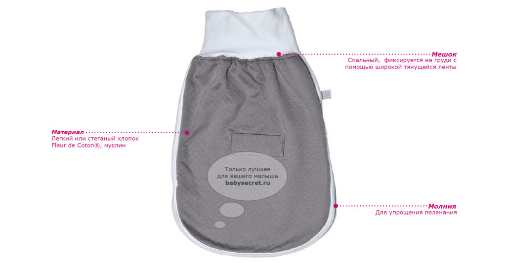 Мешки хоть и делаются из легкого, дышащего материала, все равно довольно теплые. Поэтому, не кутайте малыша когда кладете его в мешок.