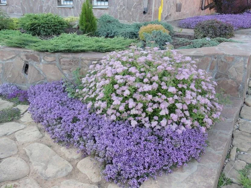 Спирею можно сделать центром композиции, посадив вокруг нее пионы, астру альпийскую, лилейник гибридный, гвоздику турецкую, розы и другие цветущие растения. Их можно комбинировать по росту, срокам цветения.