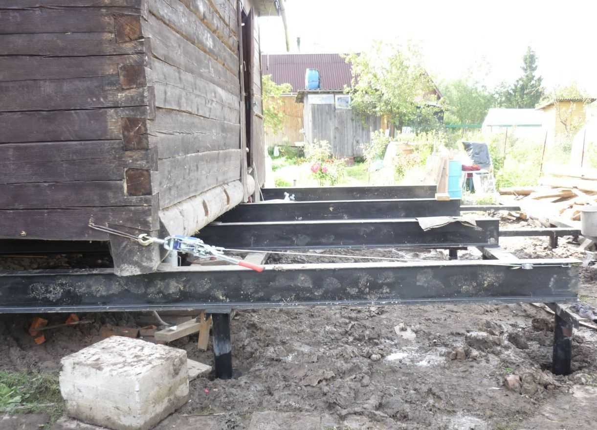 - Если дом деревянный, вся конструкция поднимается на временные опоры, после чего происходит связка оголовков ростверком. После этого строение опускается на новый фундамент.