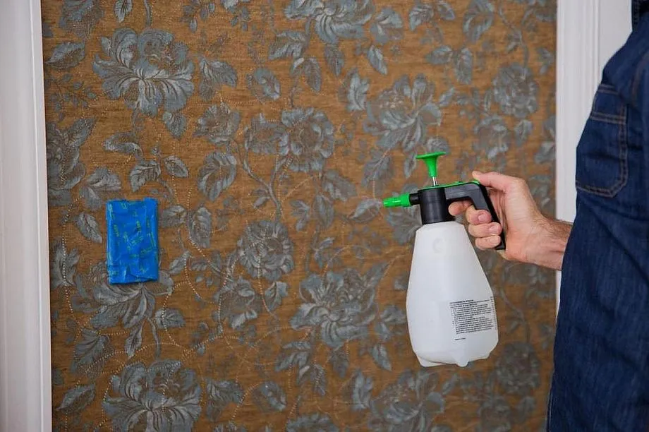 Трещины и плохое прилегание к стене станут причинами полного демонтажа материала. Перед тем, как быстро снять флизелиновые обои, надо смочить перегородку. На поверхность губкой, малярной кистью или ручным опрыскивателям обильно наношу горячую воду, оставляю на 30 минут.