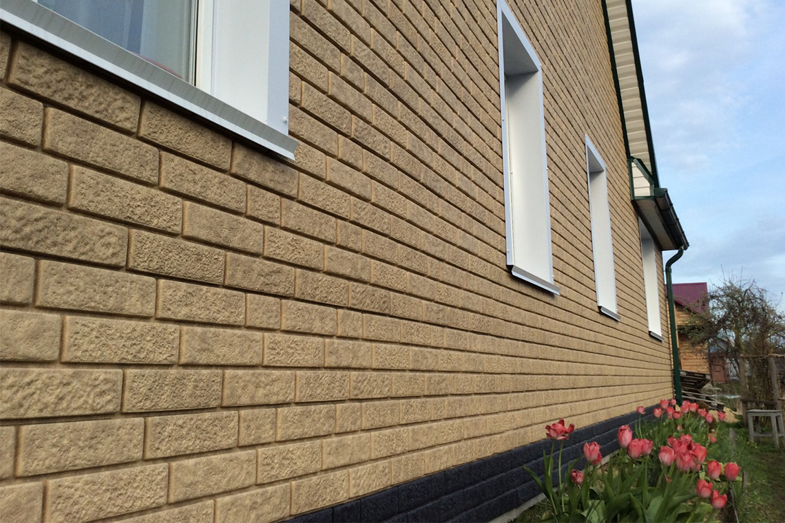 Стоун-хаус внешне похож на кирпичную или каменную облицовку. Панели с этой текстурой подходят для обшивки цоколей, чтобы имитировать фундамент здания. Также дом можно полностью обшить стоун-хаусом, который придает постройке более основательный вид.