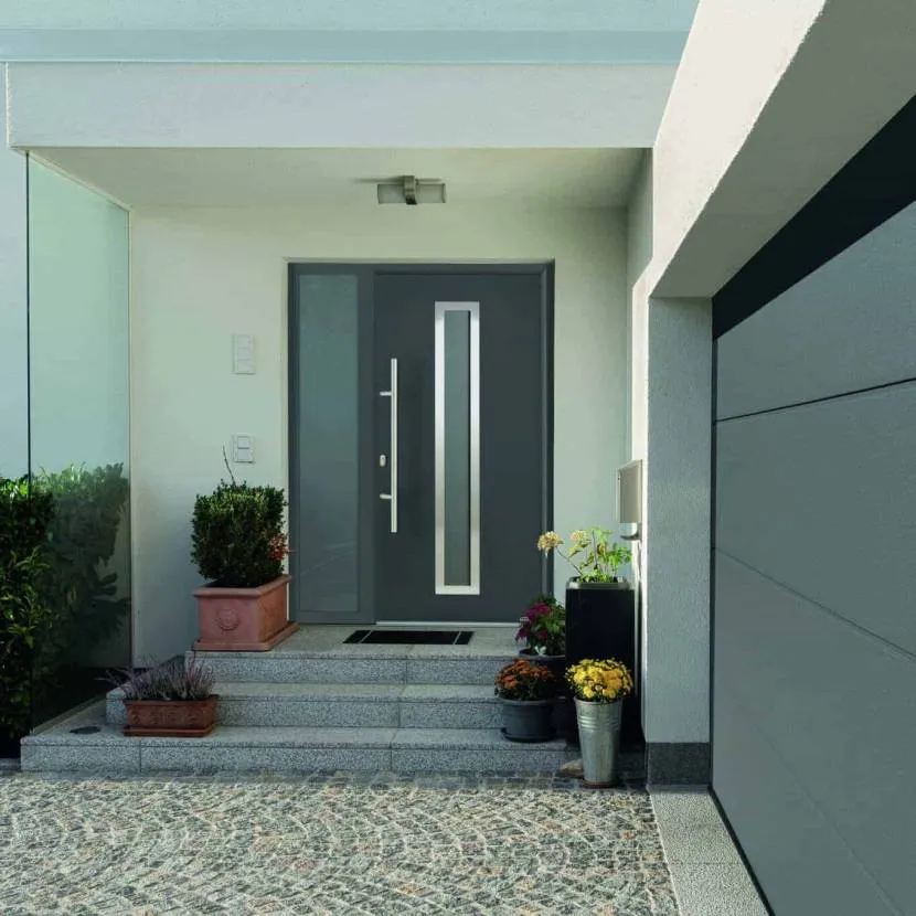 У входных дверей Thermo65/Thermo46 имеется еще одно важное преимущество: их можно подобрать под гаражные ворота, и получить единый ансамбль, гармоничное дополнение архитектурного стиля загородного дома. Подъемно-поворотные или секционные ворота в любом исполнении также обладают энергосберегающими и взломостойкими качествами, а в их производстве используется энергосберегающие технологии