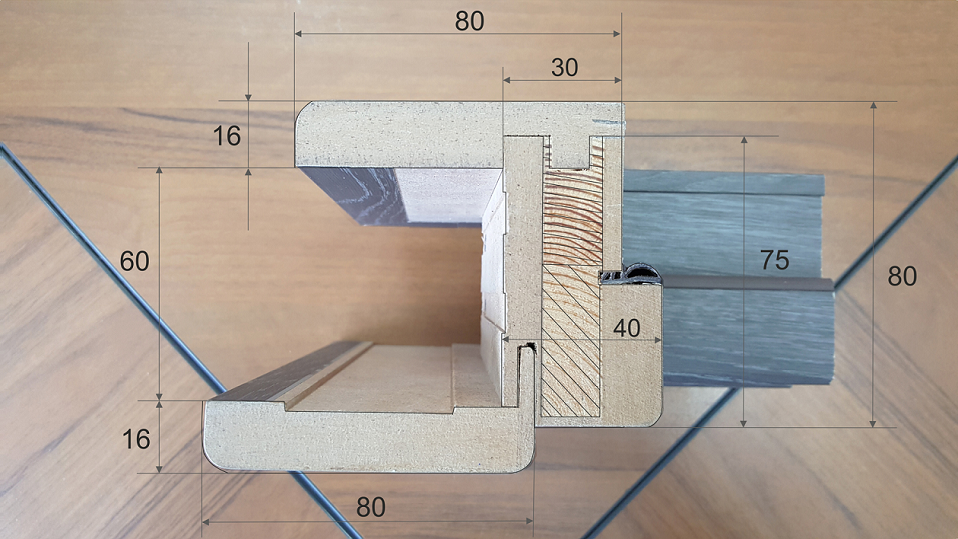 - Толщина дверной коробки 35 – 40 мм с выборкой для притвора 10 мм позволяет подобрать полотно у любого поставщика с одинаковыми узлами сопряжения, вне зависимости от места изготовления обрамляющего элемента.