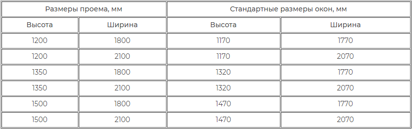 Приведённая ниже таблица показывает соотношение размеров монтажного проёма и окна, которое в него устанавливается.
