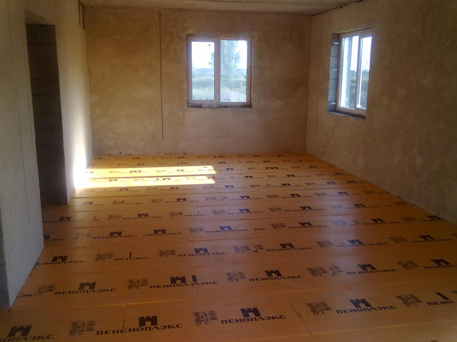 Инструкции как утеплить пол пеноплексом просты в исполнении, такие работы под силу выполнить начинающим строителям. Материал используется как основа для теплого пола. Нагревательные системы закрепляются над листами, а высота стяжки зависит от высоты основных элементов.
