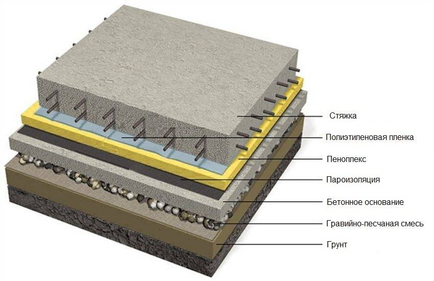 В данном случае толщина стяжки будет больше и обычно равняется 5-10 см. Затем укладывают пеноплекс, но только после полного высыхания бетонного основания. Следовательно, стяжка на пеноплекс технология устройства которой аналогична таковой для жилых помещений, будет отличаться лишь толщиной слоя.