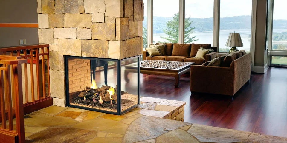 Трёхсторонний камин с панорамой из термостойкого стекла
