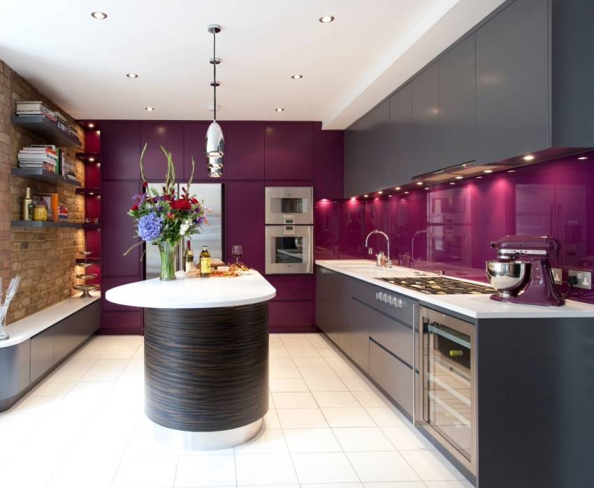 Цветное полотно из глянцевого стекла освежает интерьер кухни
