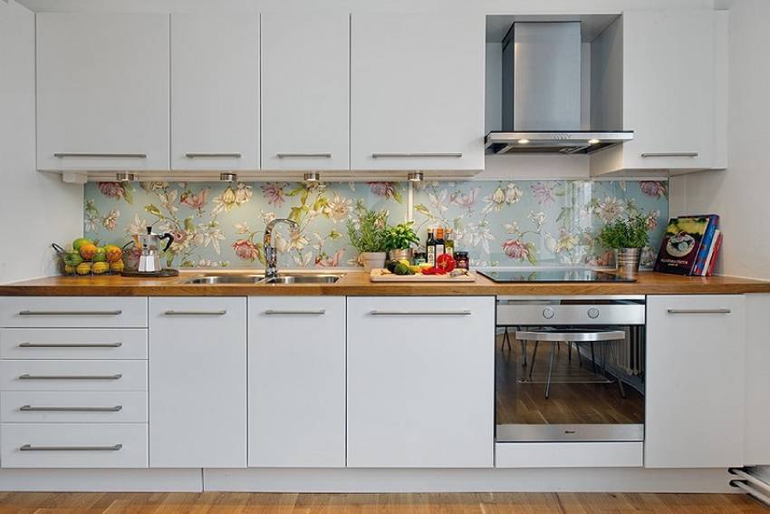 Часто стеклом закрывают обои или покрашенные стены, чтобы не перегружать интерьер кухни разнородными поверхностями
