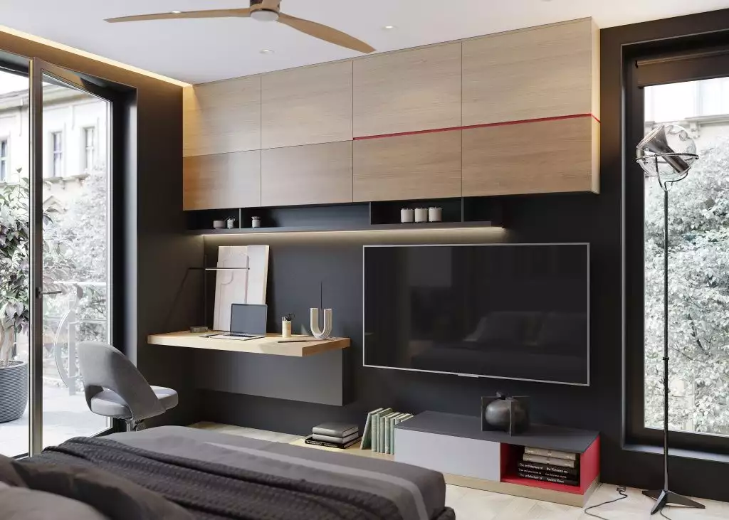 Размеры имеющейся свободной площади, расположение других элементов интерьера. Например, стенка в спальню со шкафом должна иметь компактные размеры и лаконичную форму.