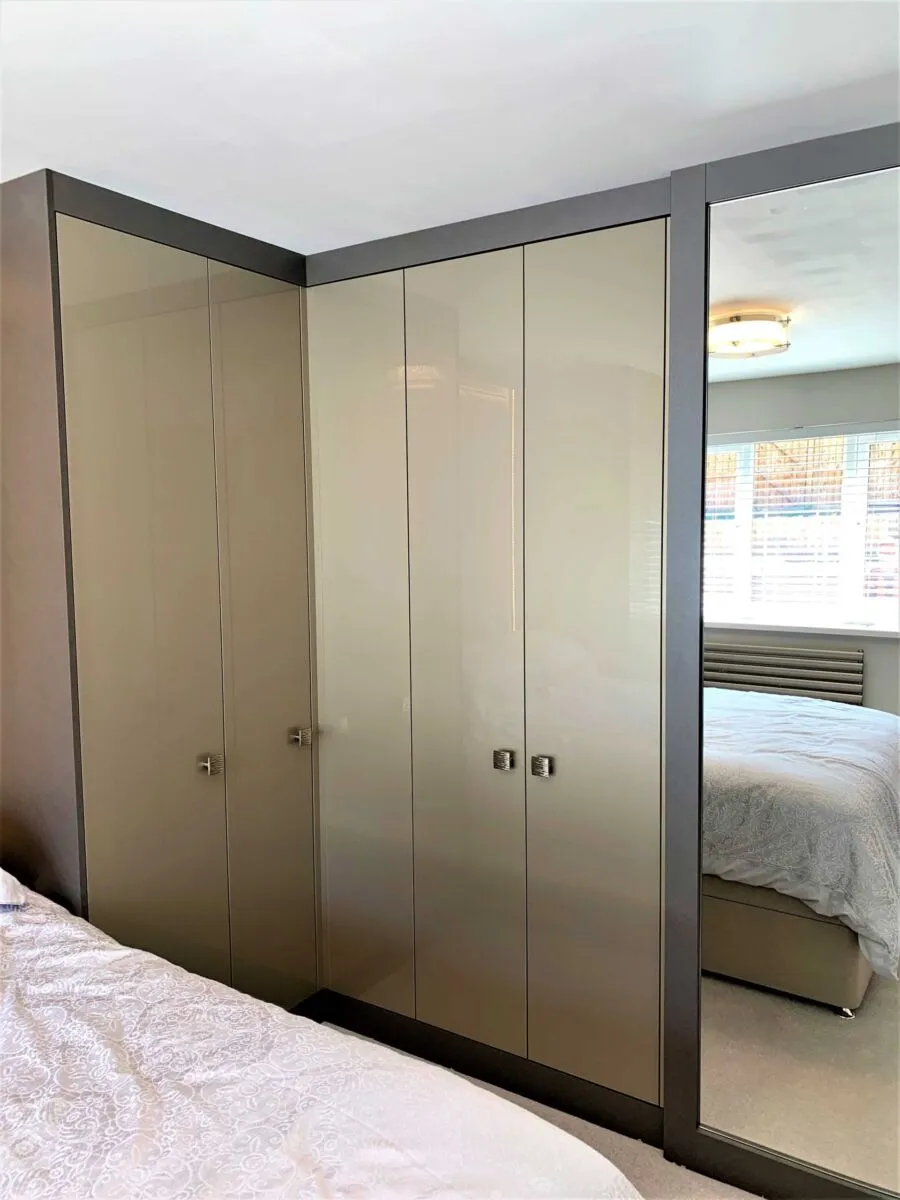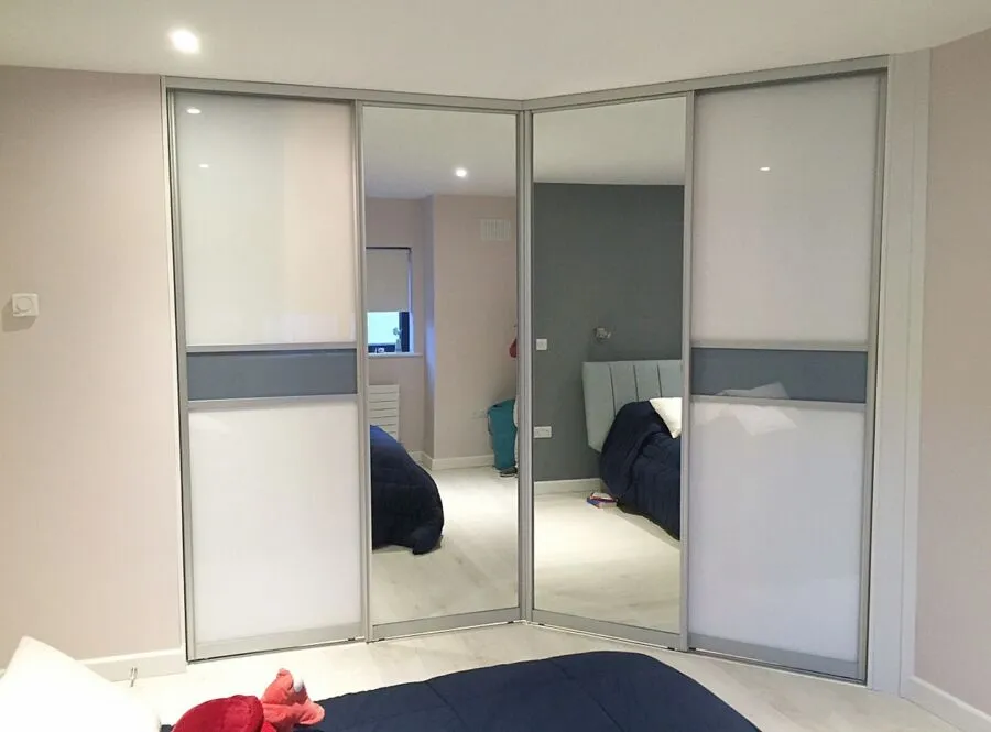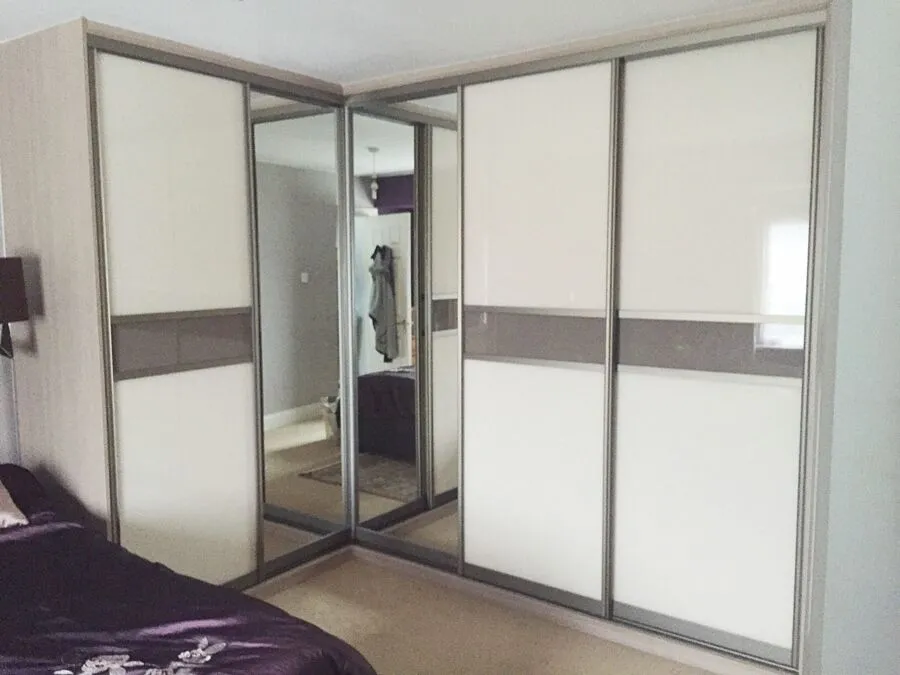 Угловой шкаф-купе в спальню послужит практичным решением для тесного помещения. Дверки у таких моделей смещаются в сторону, поэтому не потребуется оставлять много свободного пространства перед шкафом.