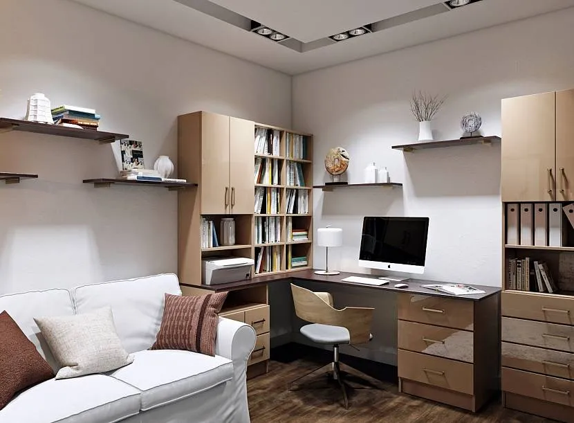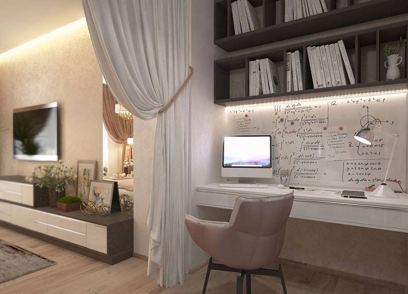 - Рабочая зона в гостиной позволяет не покушаться на место в спальне или кухне, где трудовая деятельность может помешать отдыху или приготовлению пищи.
