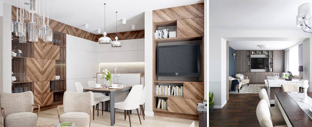 - разделение гостиной на 2 основные зоны: столовую и зону релаксации;