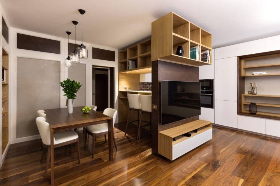 Для классических вариантов актуально расположение по центру совмещения двух помещений обеденного стола и стульев, которые выполняют роль разграничения между двумя функциональными зонами. Вариация выраженного зонирования кухни предполагает чёткое отделение рабочей зоны при помощи «острова» или барной стойки. Для примеров с приоритетным положением кухни актуально использование барной стойки или «острова» и в качестве рабочей зоны, и в качестве обеденного стола. Зона отдыха в этом случае предполагает наличие минимального набора мебели.