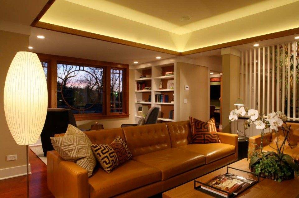 Используйте светодиоды для подсветки небольших и незначительных элементов, на которых хочется сделать акцент. Свет, падающий сверху (с потолка) на диваны или рассыпающиеся в стеклышках витражей отражения светодиодов придадут обстановке интимности, а саму гостиную сделают будто бы бесконечной.