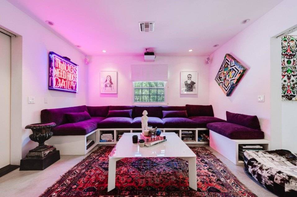 На фото посудный шкаф с декоративной разноцветной подсветкой в интерьере гостиной.