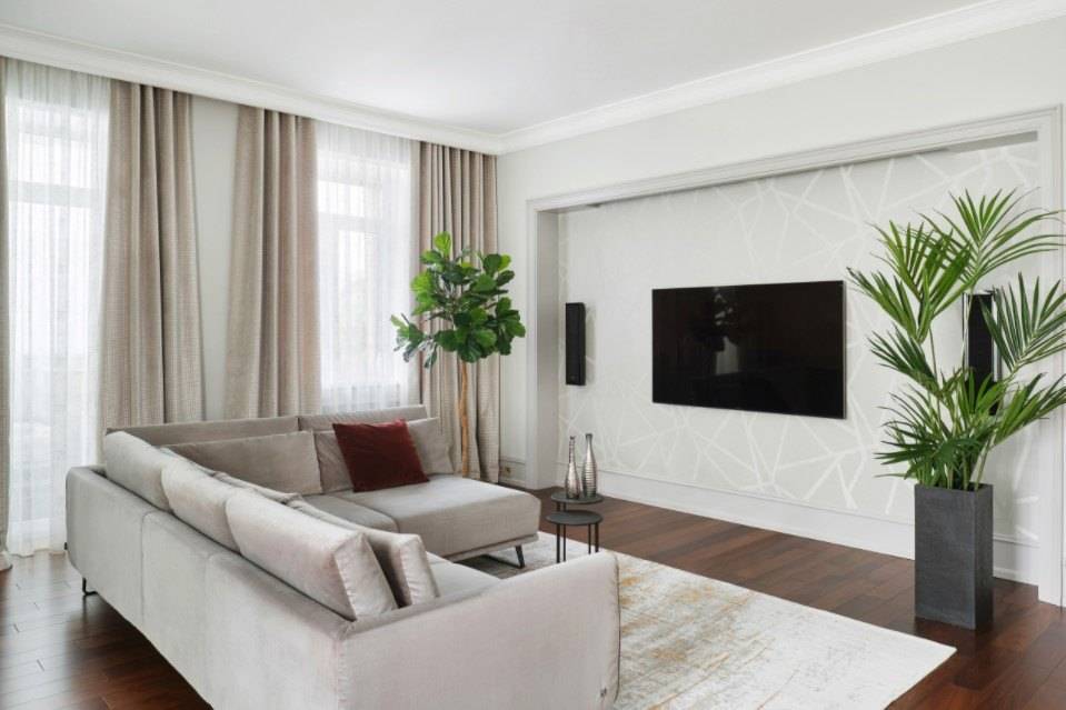 Классическая белая стенка позволяет использовать элементы мебели в разных вариациях с разными стилями интерьера. Она отлично представлена в гостиных, оформленных в стилях: