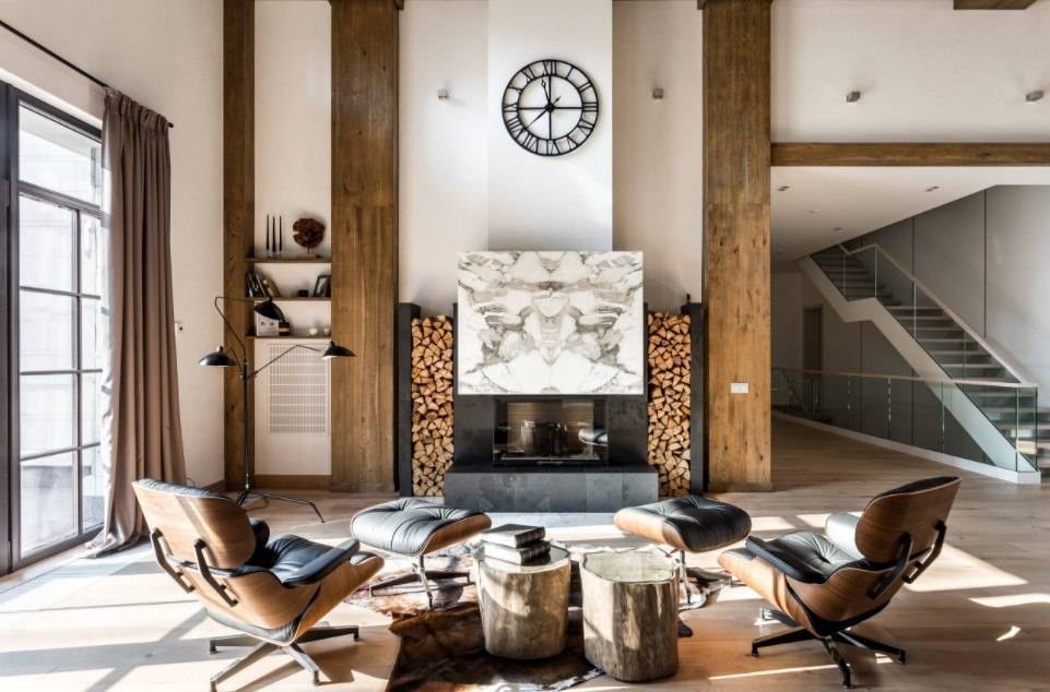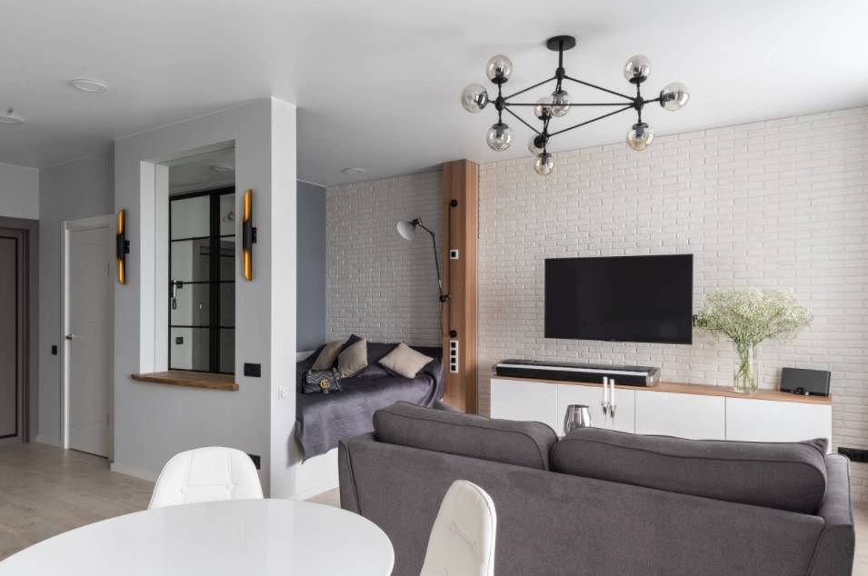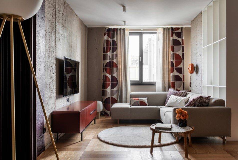 Альтернативой минималистическому может стать индустриальное оформление дизайна длинной и узкой гостиной. Для его воплощения в жизнь рекомендуем: