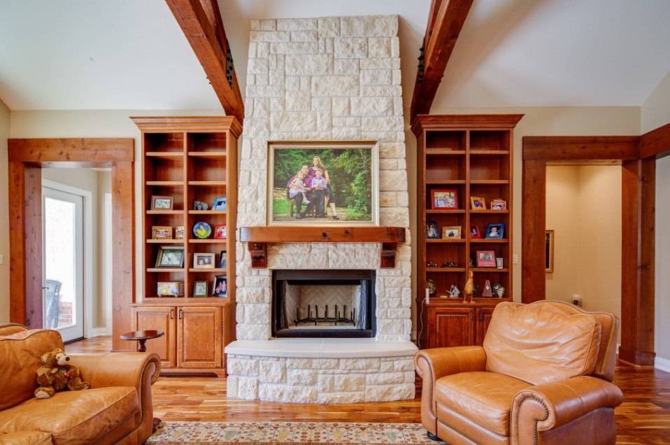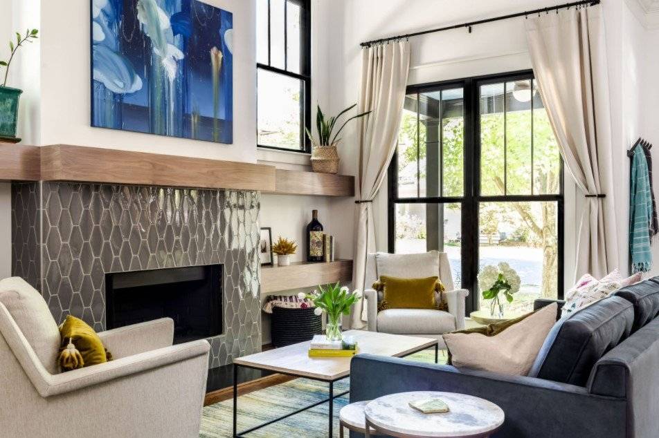 - центром комнаты часто становится камин, на котором установлены подсвечники, фонарики, декоративные рамки с фотографиями;