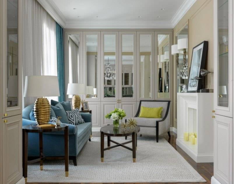 - Функциональность всех элементов обстановки. Речь идет об оснащении узкой и длинной комнаты трансформирующейся мебелью и выполняющей функции 2 в 1 и 3 в 1. Отлично подойдет узкая стенка в гостиную, компактный сервант «горка», зеркальный шкаф-купе.