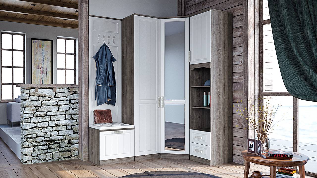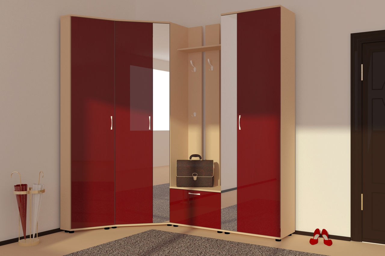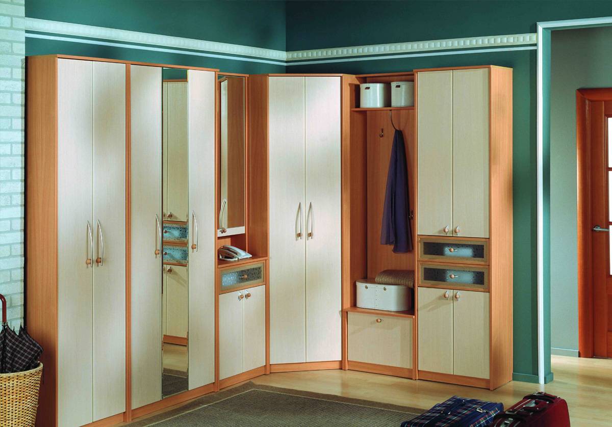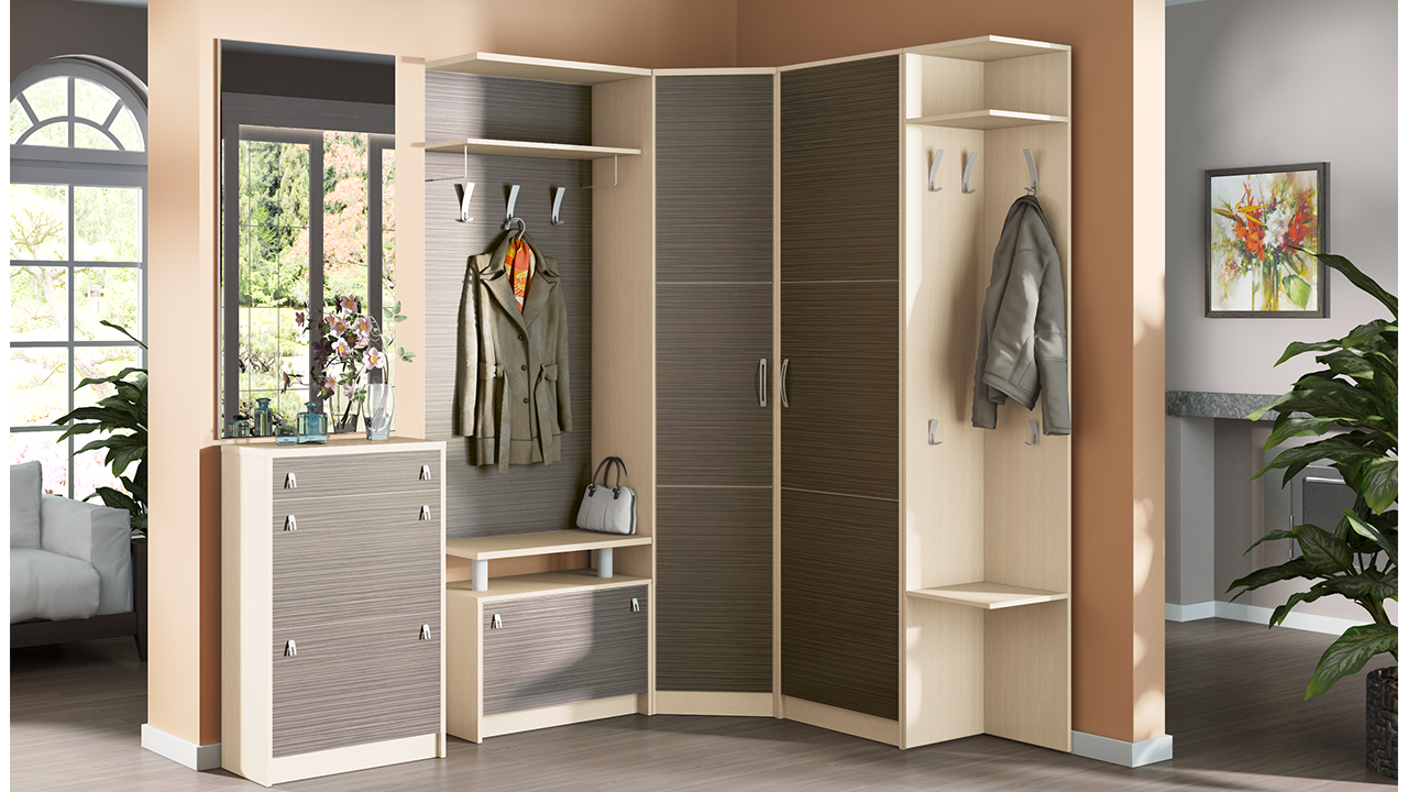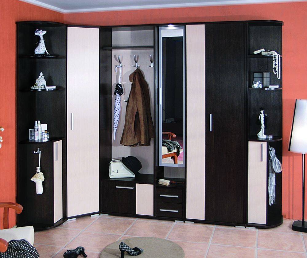 Прихожая, занимающая один из углов – распространенный вариант меблировки. Благодаря такой мебели помещение становится уютным. Оптимальный вариант для малогабаритной квартиры мебель симметричной формы, шкафы и закругленными краями. Практичные открытые конструкции смотрятся современно.