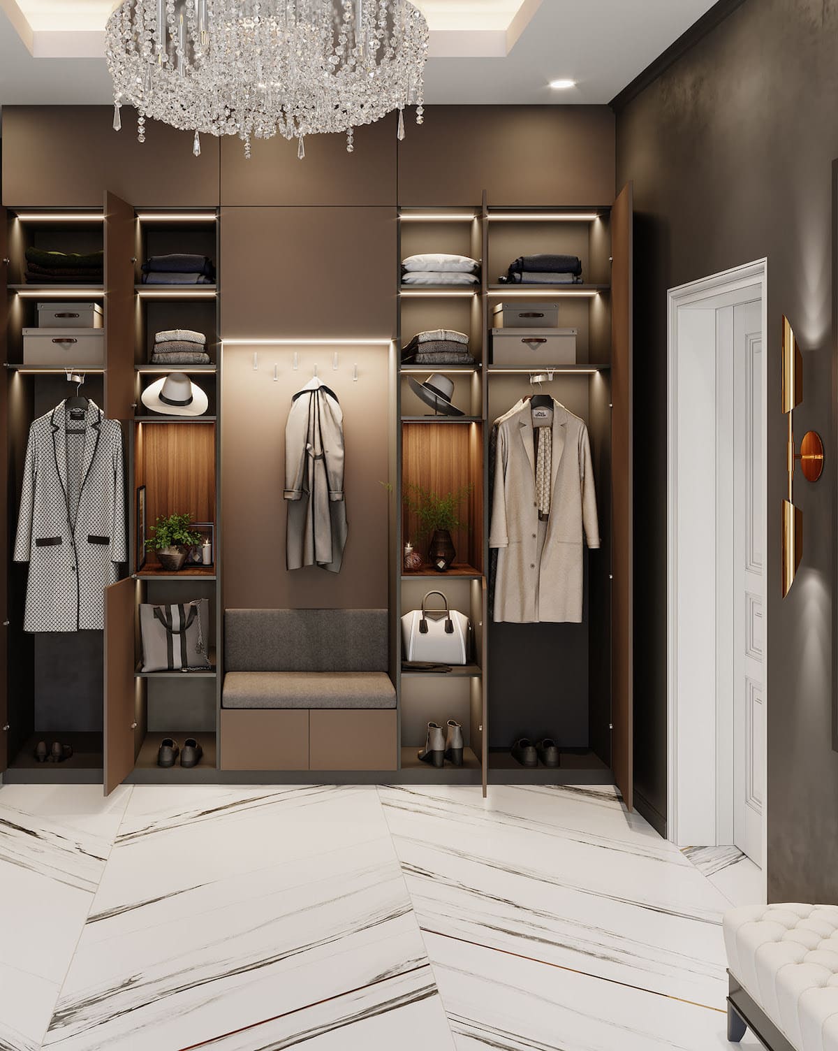 В современном дизайне часто используют многоуровневую систему освещения. Несколько источников света — это удобно и практично: чтобы найти одежду в шкафу или посмотреться в зеркало, необязательно включать верхние яркие лампы.