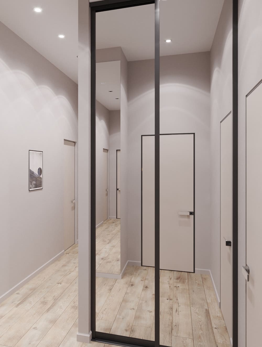 Вариант, когда зеркало установлено на всю стену в узкой прихожей, не подойдет. Такое месторасположение зеркальной поверхности лишь сделает коридор еще длиннее. Альтернативой послужит деление большого зеркала на несколько прямоугольных частей.