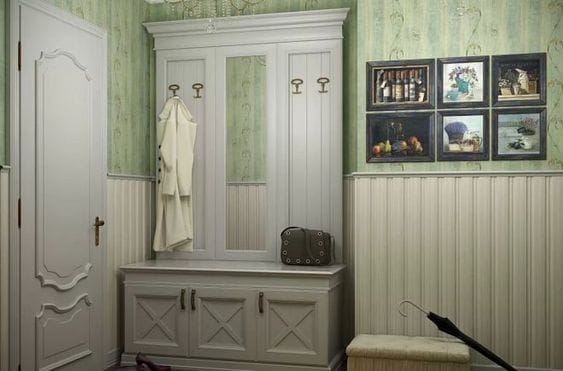 Привычный набор мебели: шкаф для верхней одежды, открытая вешалка или крючки для повседневных вещей, решетка для грязной обуви и полка для сухой или узкая обувница (шкаф для обуви), тумбочка или комод для хранения мелочей.