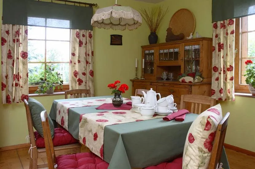 Текстилю должно уделяться особое внимание. Для кухни необходимо выбрать скатерть, вышитую вручную