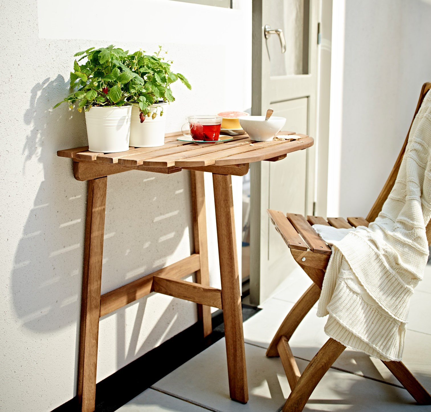 Деревянный складной столик удобен на балконе